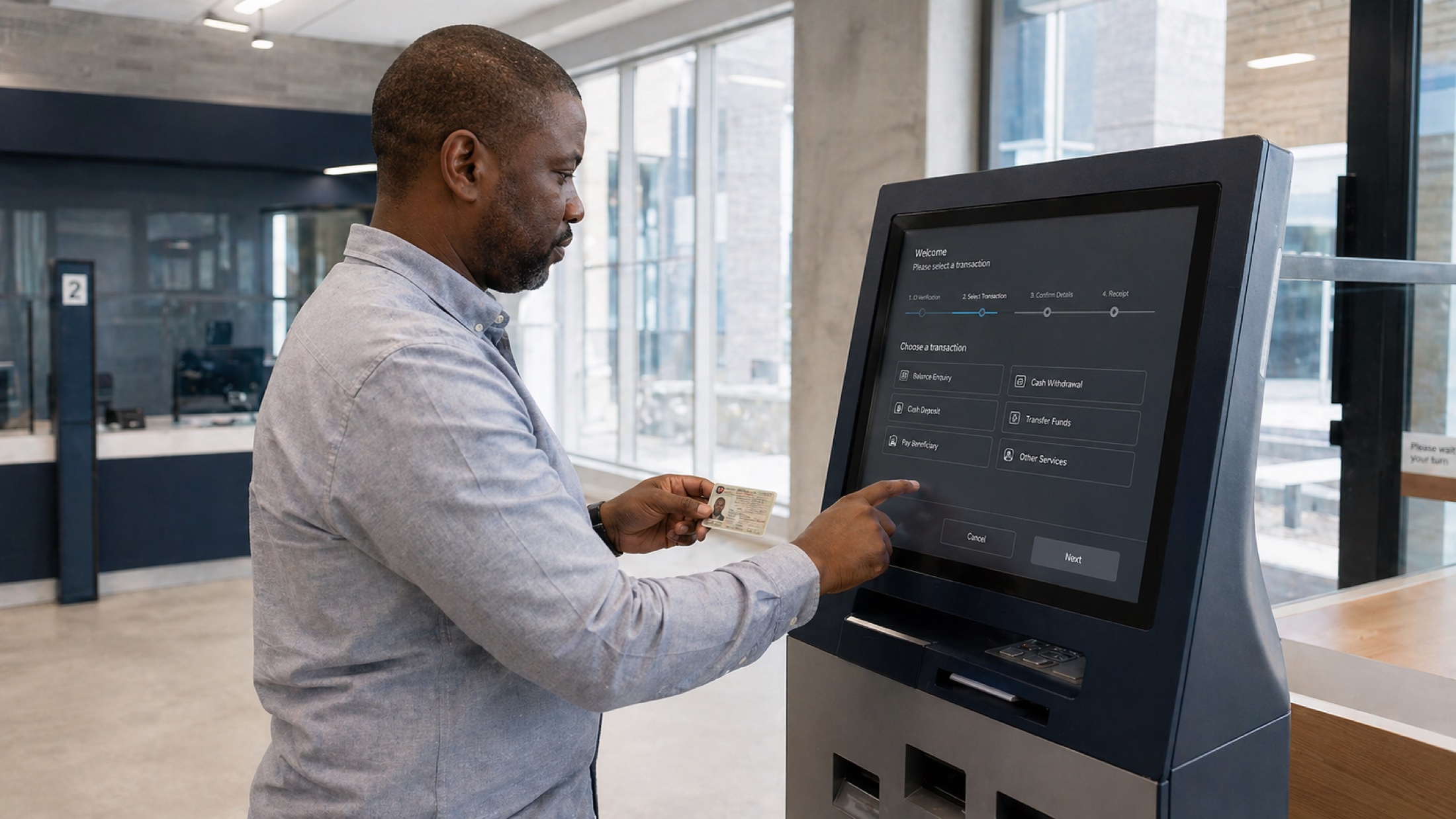 Multi-step kiosk flows — payment, account opening, ID verification — signed and hash-linked from first touch to last.